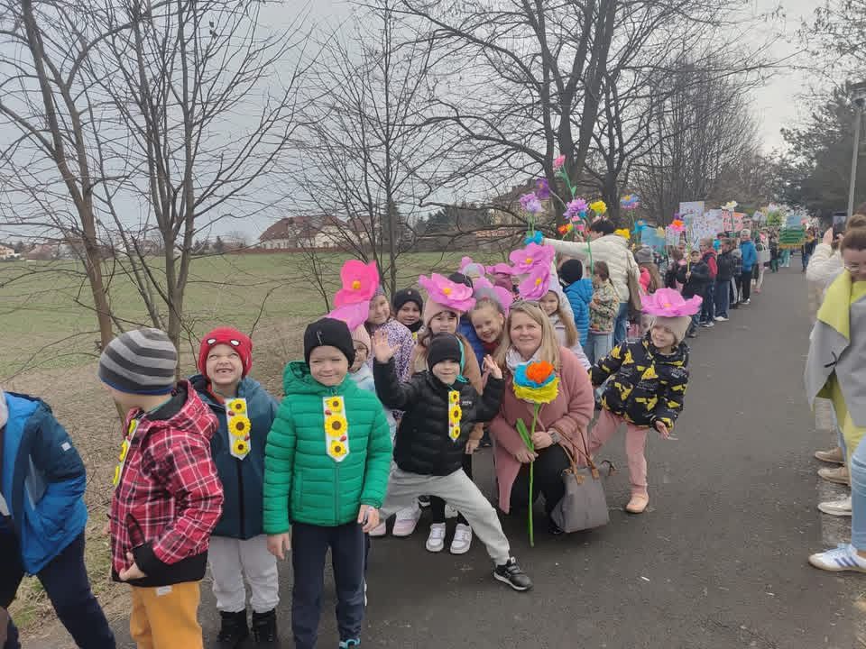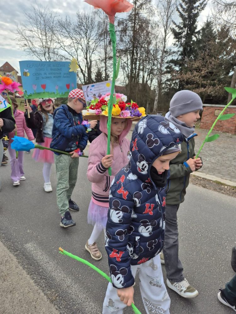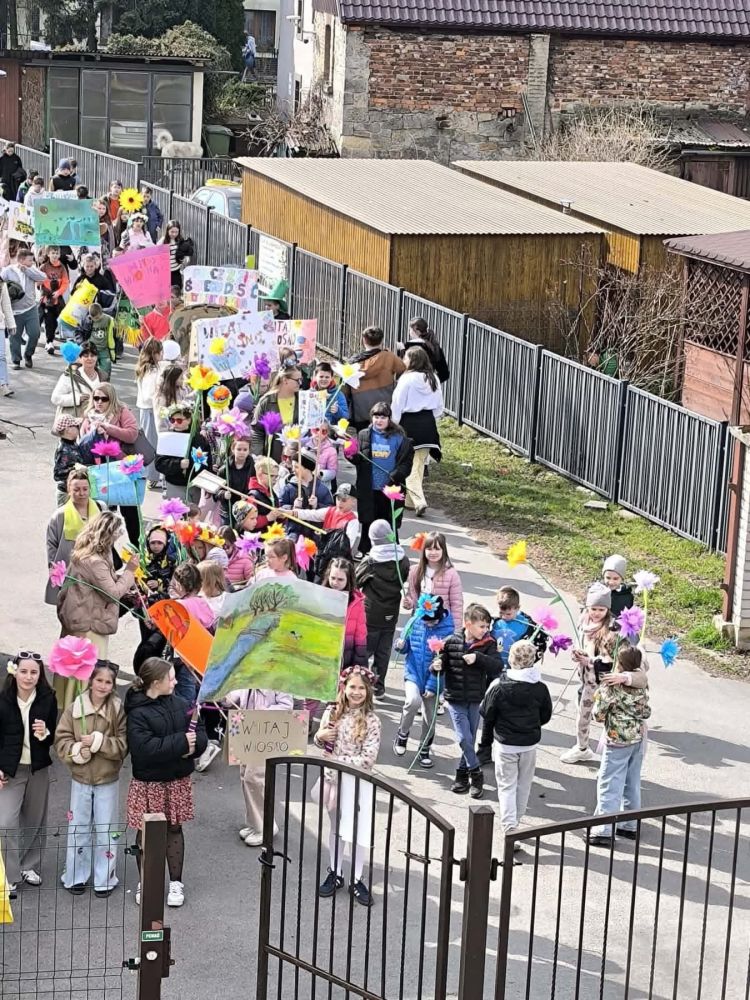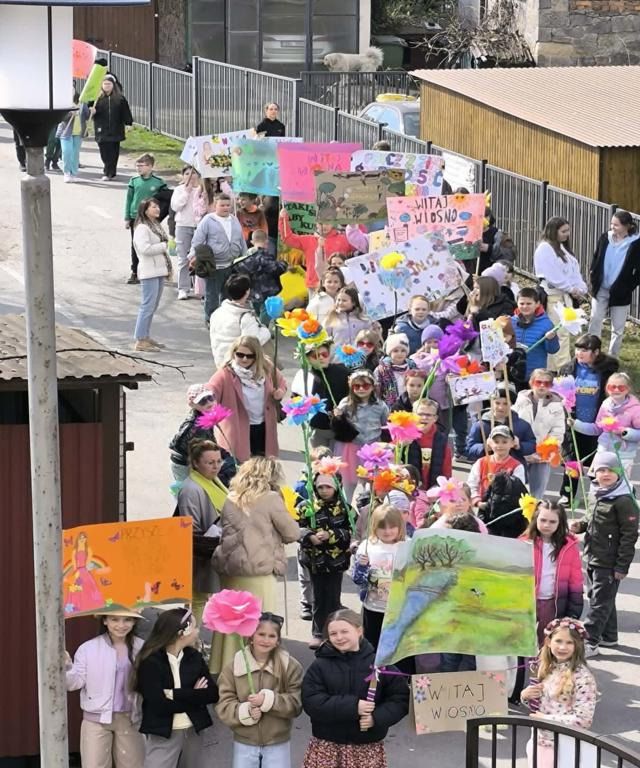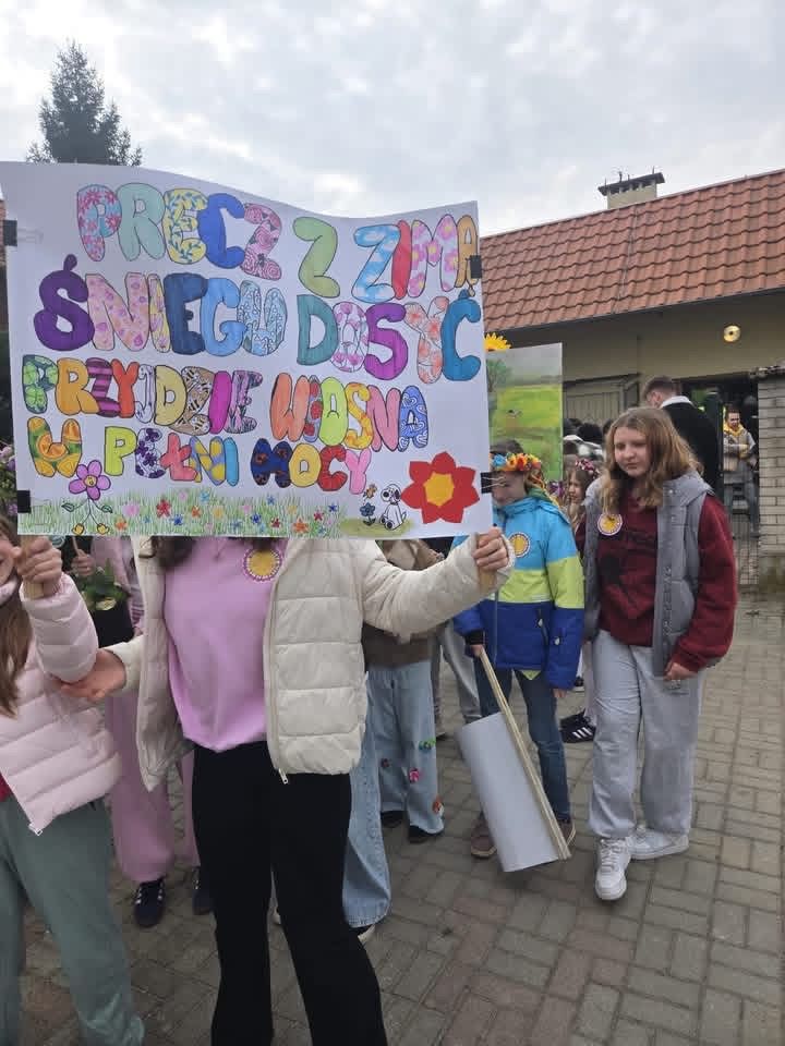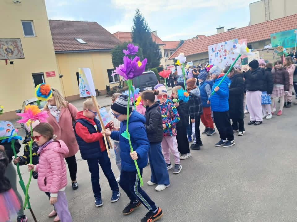W poniedziałek 23.03.2026 r. odbył się wyjątkowy, kolorowy pochód witający wiosnę. Uczniowie, niosąc własnoręcznie przygotowane plakaty i transparenty z hasłami „Witaj Wiosno!”, wyruszyli, by wspólnie świętować nadejście nowej pory roku.