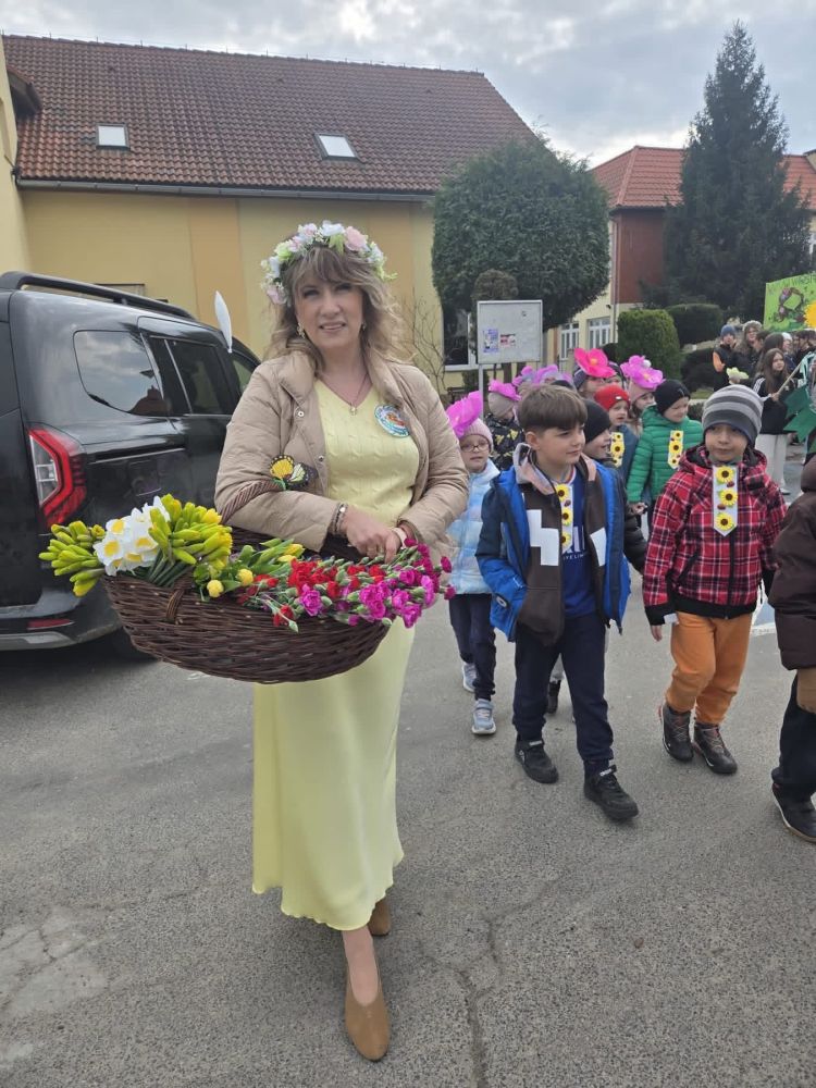 Społeczność szkolna wędrowała pochodem, obdarowując napotkane osoby kwiatami oraz cukierkami, dzieląc się radością i wiosennym nastrojem.